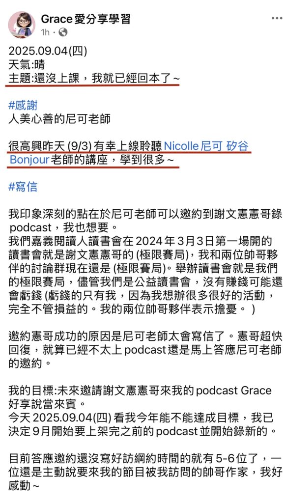 結果這場直播講座為我帶來3個Podcast訪談邀約、許多參加的人紛紛主動在網路上分享好評,連知名開課平台Hahow都寄信邀請我針對這個主題開課,算是收穫了許多意想不到的果實。
